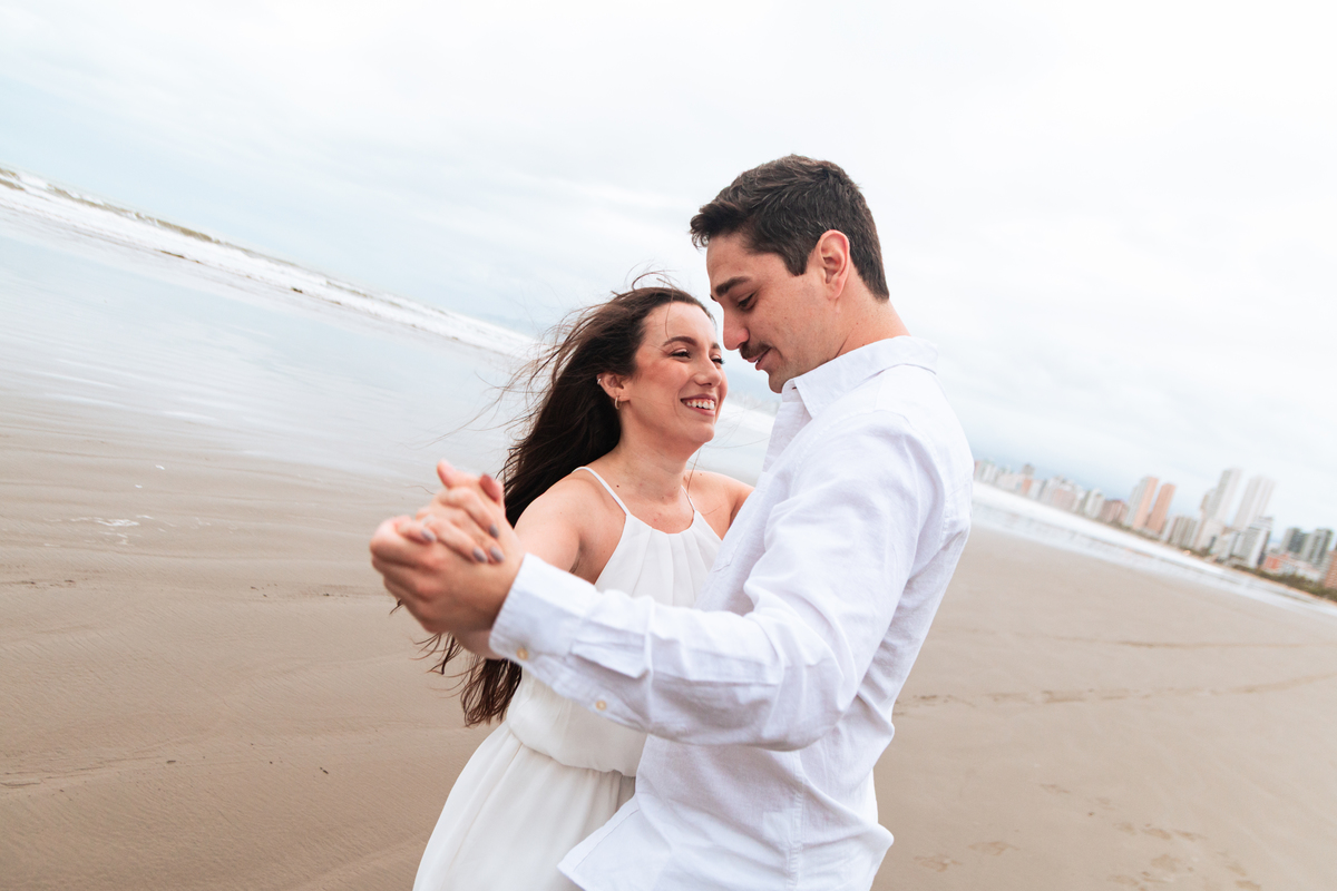 A luz suave do dia nublado trouxe um toque romântico e atemporal às fotos, mostrando que o clima perfeito para o seu ensaio de casal na praia é aquele em que vocês estão à vontade, sendo vocês mesmos.