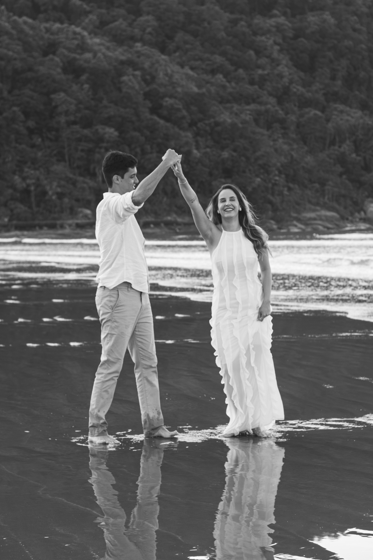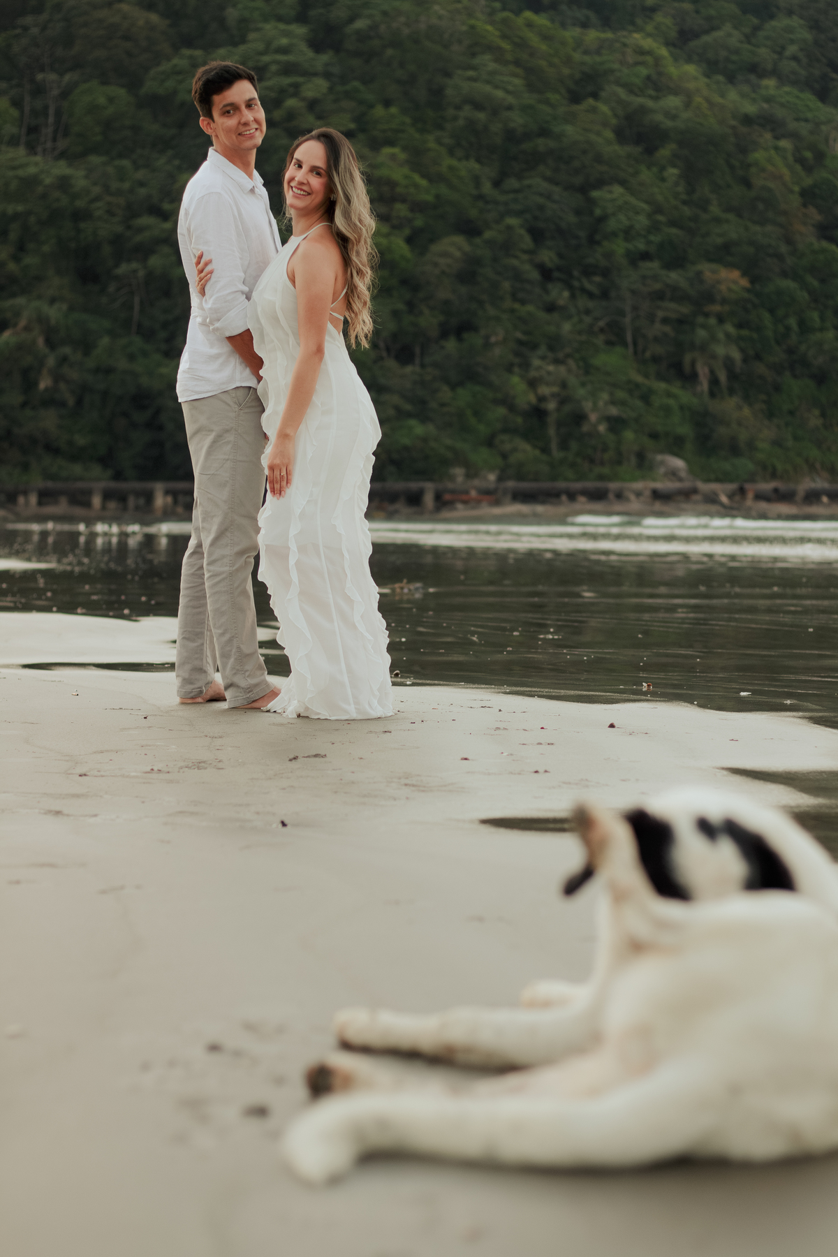 Vindos de Minas Gerais, eles escolheram a Praia Grande para viver essa experiência e transformar a viagem em parte da história do casal. O amanhecer trouxe uma luz perfeita, mar calmo e uma vibe descontraída, com muitas risadas, conversas e momentos espontâneos — incluindo a participação inesperada (e divertida) de um cachorro que cruzou nosso caminho.